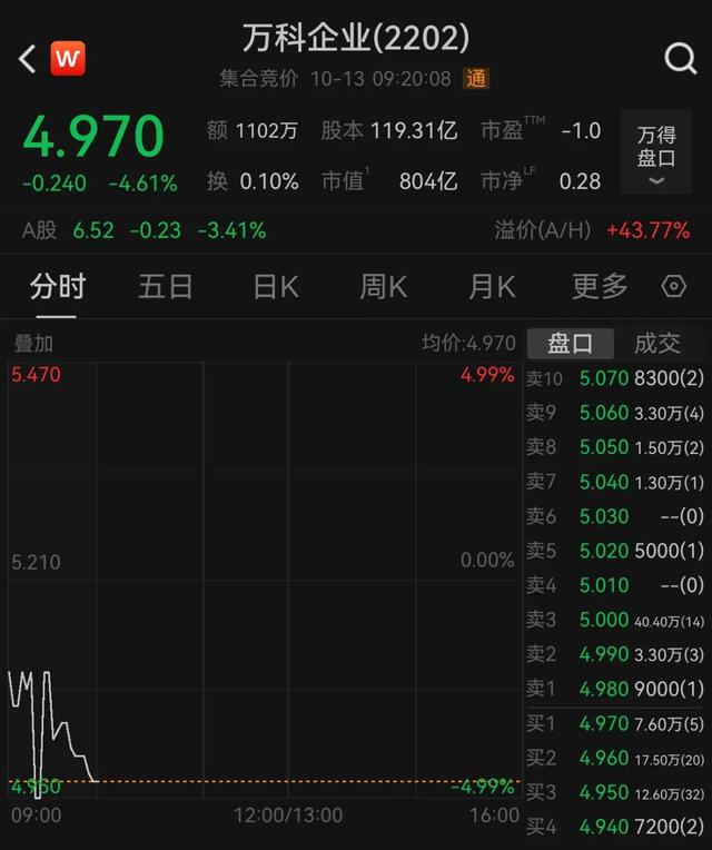 今天(10月13日),港股万科大幅低开4.61%;A股方面,万科一度跌超3%。