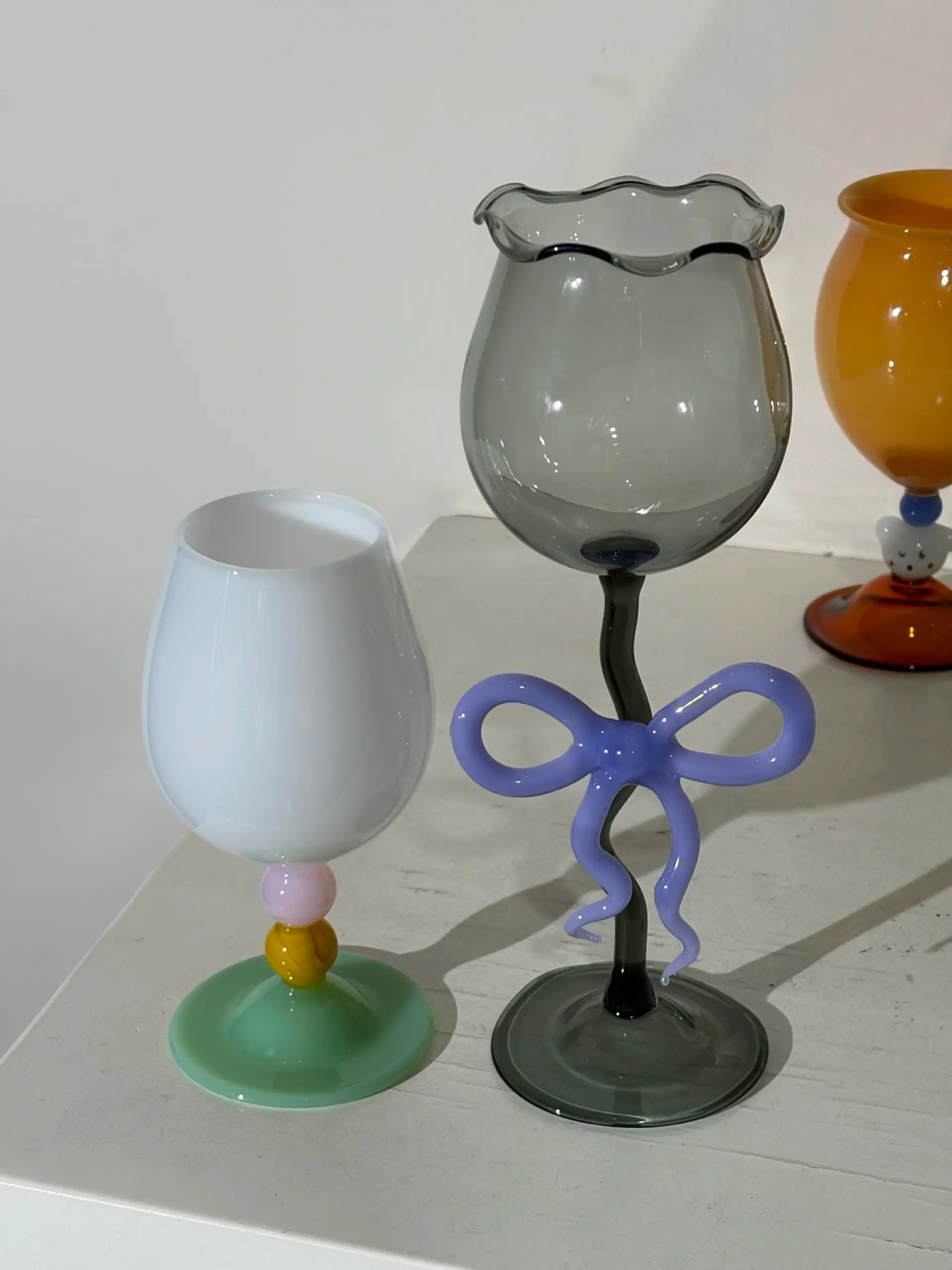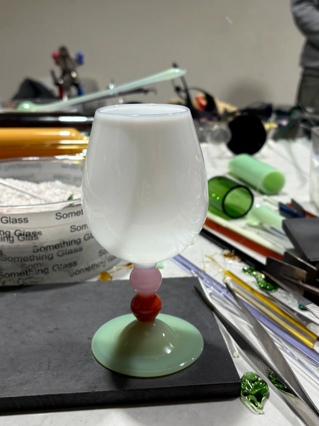 最后的塑形是与时间的博弈。在玻璃冷却前,用工具果断拉出杯脚。手不能抖,脑子不能犹豫。反复调整虽然繁琐,但当成型的高脚杯泛出琼脂般的透亮光泽时,成就感油然而生。