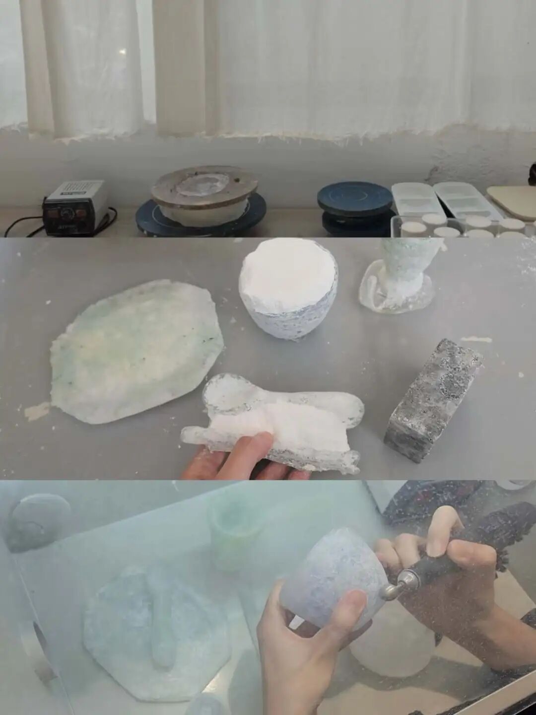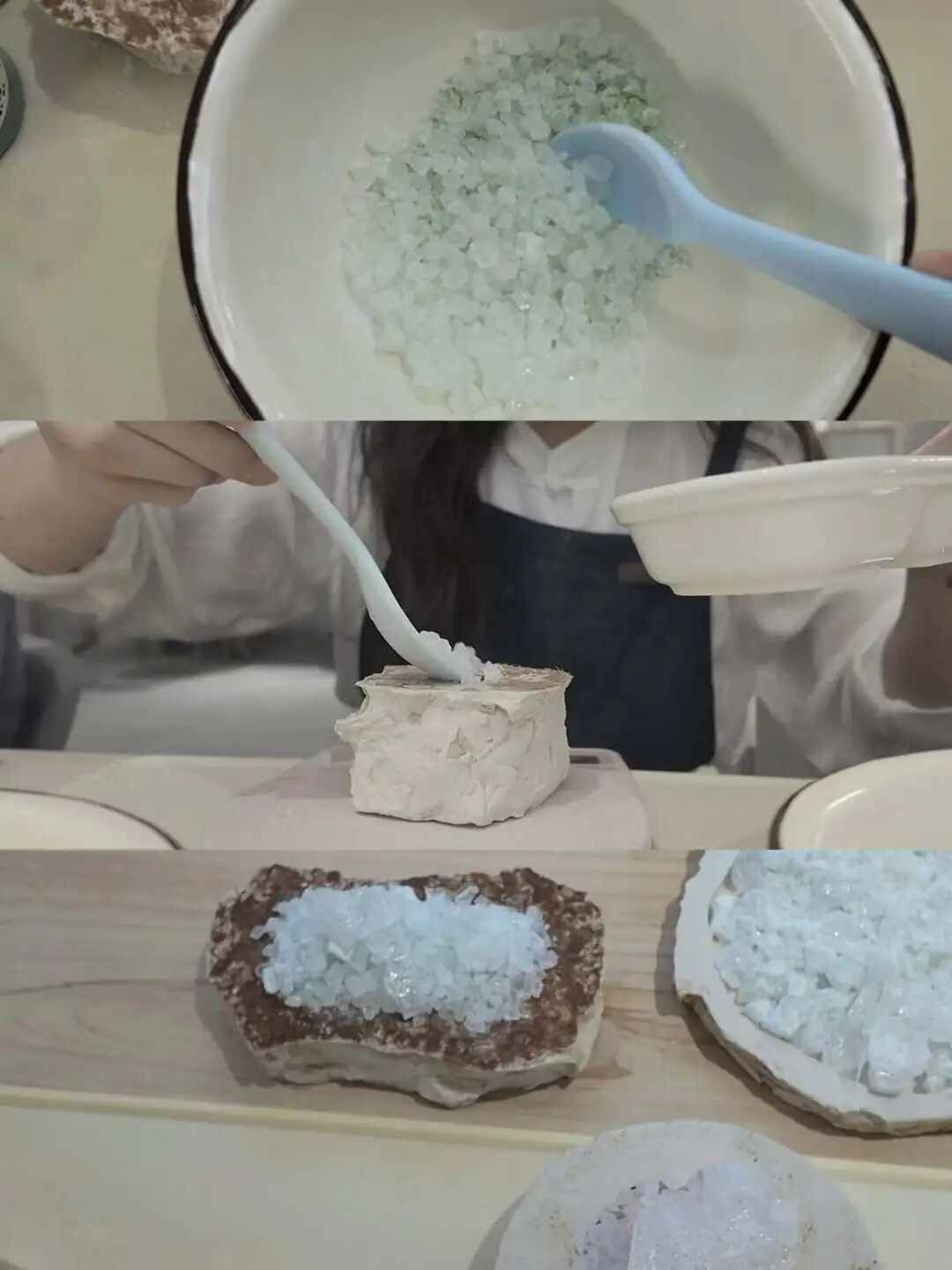 它与吹玻璃的热塑原理不同,在这里,色彩是唯一的主角,过程更像一场严谨的色彩构成与高温化学实验。第一天,老师会教你构建泥胚的轮廓和围挡,有点像玩泥巴;第二天你则要小心翼翼地剔除泥土和调配色粉,这一步是最减压的,有点像“采耳”;最后一天要敷彩上色、打磨成品、等待窑变,在不可预测中让期待拉满。