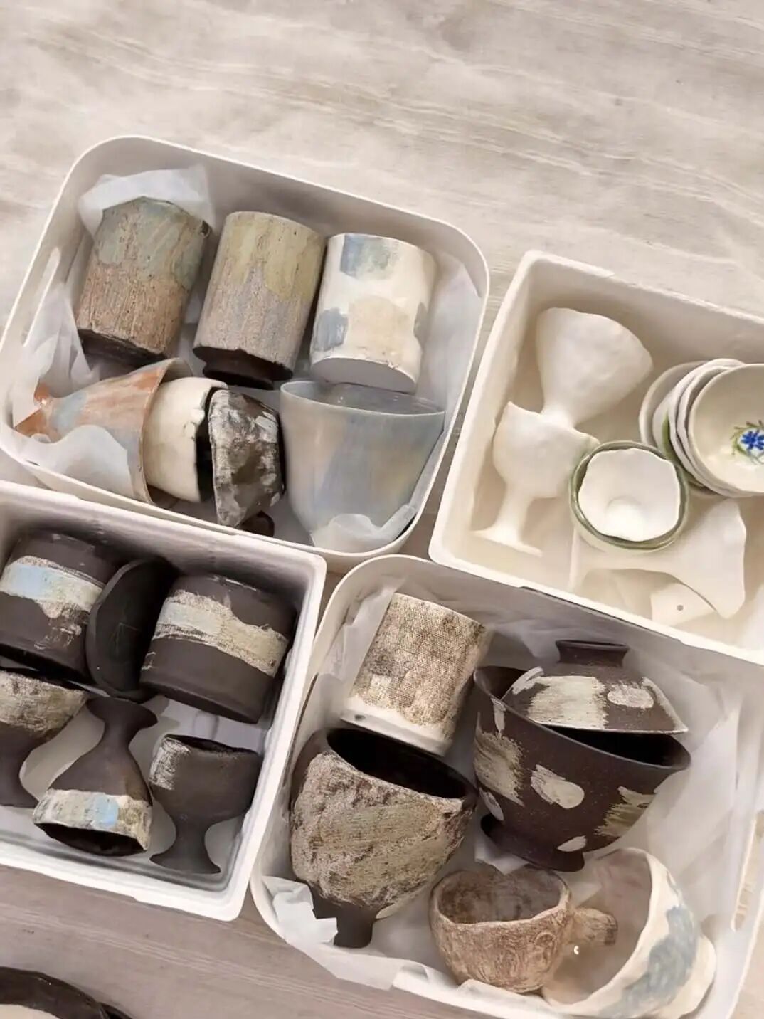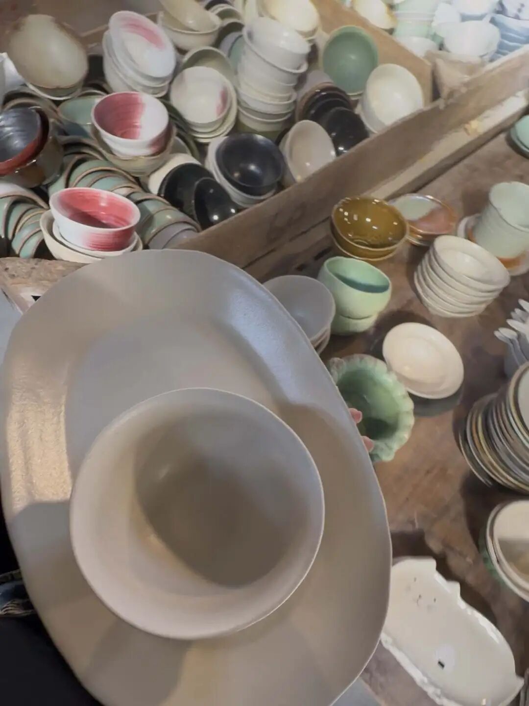 想用实惠价格买到好东西的话,不妨转战窑亦窑折扣仓,这里堪称“景德镇人的两元店”,堆满了各大窑口的微瑕品和库存,均价不过百元。需要你耐心淘,瑕疵可能小到忽略不计,大都是釉面上的气泡或浑然天成的窑变色彩,也可能瑕不掩瑜。不仅考验眼力,还充满惊喜,买到就是赚到。那天选了几只珍珠光泽的素色浅盘,还有两只釉色深邃、形态不羁的花瓶,价格只是市价的零头。挑挑拣拣,淘多了也无妨,可以直接邮寄回家。
