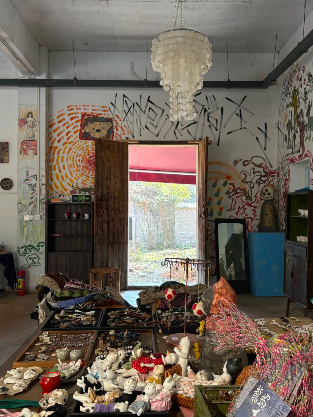 近午时分,摊主们如学生下课般利落收摊,美好过时不候。意犹未尽可顺路逛740厂,相比于游人如织的三宝村和雕塑瓷厂,这片老厂区更静默自在,错落分布着几家工作室、画廊、咖啡店。里面有家叫“泥海Niihai” 的艺术空间可以慢慢淘货,隔壁的“窄门咖啡”则很适合坐下来晒太阳发呆。