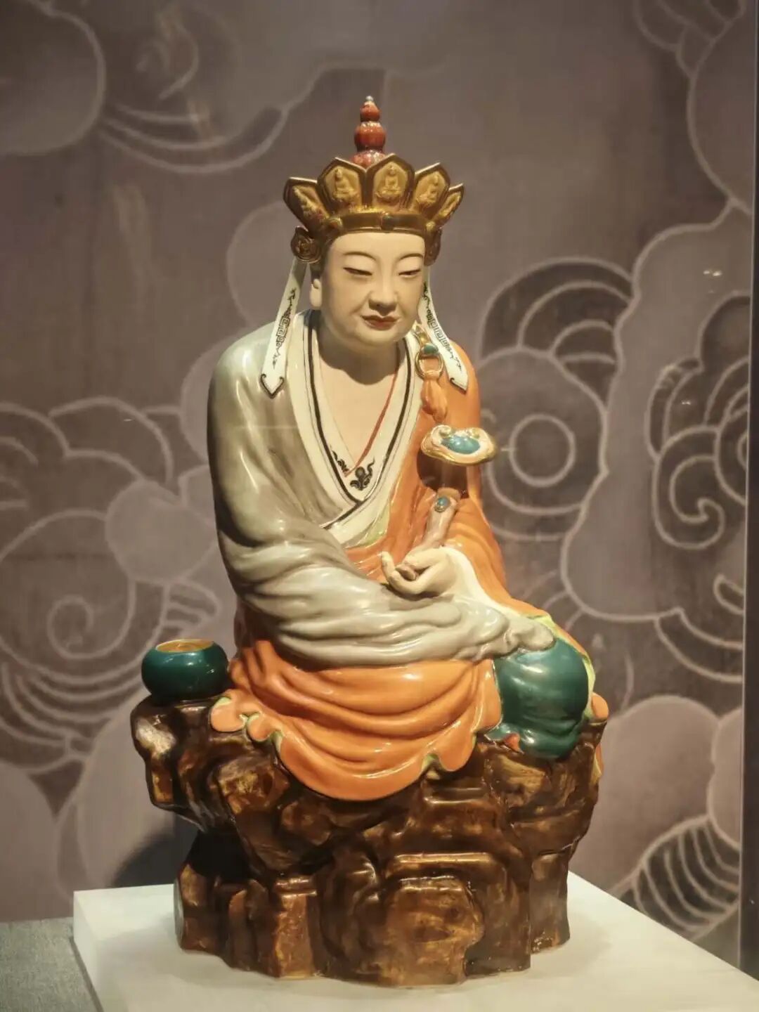 你会在常设展厅的清代陶瓷展区看见它——因一脸“生无可恋”而火爆全网、被戏称为“无语佛”的罗汉。它的本尊,是釉下加彩十八罗汉塑像中的沉思罗汉。请务必绕到侧面,从稍低的角度仰望:微蹙的眉峰、下垂的嘴角、欲言又止的微妙神情,那份看透世事的疲惫与温和的无奈,会瞬间击中你。它所在的整个组像是清代瓷雕艺术的巅峰,其他罗汉或慈祥或威严,都展现了当时匠人的高超技艺。